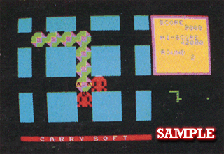 | 特徴(概要) | ポニー主催のコンテストから生まれた作品。作者は、このあと「宇宙の戦士」や「ライトフリッパー」を作った岡田氏。プレイヤーはお花畑を守るかわいいシェリフ(保安官)である。次々に現れる虫や爬虫類をピストルで撃つ。ただ、ピストルの弾がはずれると壁や花に当たってなぜかはねかえってくるので、自爆に注意しなければならない。すべての敵を撃つとクリア。歩くたびにビープ音がなり、その他の効果音もたくさん入っている。敵の種類も相当多い。 | ||
