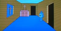 ここは礼拝室。十字架が架けてあっても亡霊は退散するどころかこっちをじーっと見ている。お祈りしたら退散してくれるほどこの亡霊は甘くはないんだ。アーメン。 |