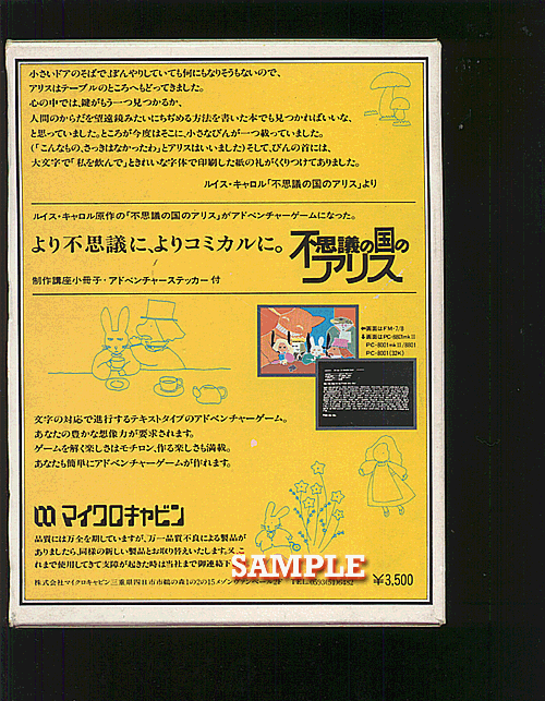 | 特徴(概要) | このころでは珍しいグラフィックのないテキストアドベンチャーゲーム。ルイス・キャロルの小説「不思議の国のアリス」からイメージを発展させたストーリー。プレーヤーは小説の中の主人公のアリスとなって、不思議の国の中を歩き回る。その中では、体が小さくなってしまうこともあれば、迷路のような森に迷い込んでしまうこともある。アメリカでは「Zork」に代表されるテキストアドベンチャーは一つのカテゴリとして認知されているが日本ではイマイチうけがわるかった。 | ||