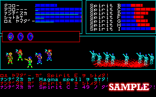 ちなみに魔法は戦闘中に使うとグラフィックで表示され、これは非常に目新しかった。たとえば、「Cloud」という魔法をかけると敵の上空に霧が発生し、いかにもみえにくくなっているようだし、最強の魔法「Magma」を使うと地面が真っ赤に染まるのである。慣れてくるとちょっとうざったい部分もあるが、このような演出は3D形式のロールプレイングではその後もあまりみられないものだったし、ここまでがんばったデザイナーの方を誉めてあげたい(ちなみにSRバージョンでは、魔法を使うとそれらしい"音"によって演出される)。