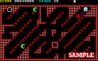 敵キャラクターもそれぞれに特徴があります。この時代のゲームは「パックマン」に影響されてか、敵が4種類ほどいて、それぞれ攻撃パターンが違う固定画面ゲームが多いのですが、これもそうです。自分をしつこく追いまわすものと、しばらくすると自爆して四方八方に破片を飛び散らす敵がいます(この破片にあたると当然ポルコンは気絶します)。でも、この自爆する敵以外は、あまり思考パターンに明確な差異がなく、もう少し明確にキャラクターの特徴づけが出来ていたら、もっと楽しめたものになったかもしれません。