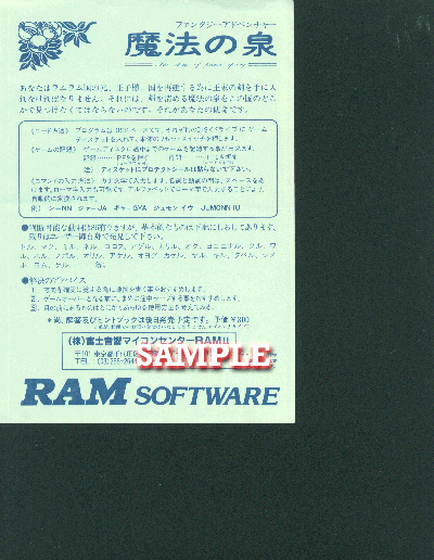 | 特徴(概要) | 本格的なファンタジーアドベンチャー。画面は瞬間表示。悪魔の手から王国を守るために、どこかにあるといわれている魔法の泉から伝説の剣をとりだすこと。非常に基本に忠実なアドベンチャーゲームで、このころとしてはちょっと古臭い感じではあった。作者は後に「セイバー」を制作した白川氏。 | ||
