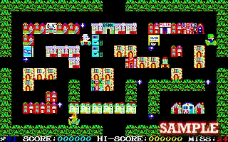 | 特徴(概要) | 30種類の敵と共にゴールまで行くレースゲーム。レースアドベンチャーと銘打っており、ゲームは実にコミカル。背景はコナミのツインビーに似ている。各面で優勝することが目的なのだが、高い丘や敵がさまざまなトラップをしかけてくる。地上にはパワーアップカプセルが落ちており、これを撃って取得してパワーアップしなくてはならない。これによって敵を攻撃したり、防御したりできる。またところどころにワープトンネルがあり、ショートカットができる。パッケージにはジョイスティックポート(汎用I/Oポート)に接続するモジュール ( J モジュール) が付属しており、それがないとゲームができない。これはどう考えても、88初のハードプロテクトである。しかし、PC88 にはジョイスティックポートが1つしかついていないので、Jモジュールを接続すると、当然ジョイスティックは接続できない。つまりこのゲームはジョイスティックではプレイできない。また、Jモジュールを接続したままだと、他のジョイスティック対応ゲームがプレイできなくなる(誤動作する)。したがってトップルジップをプレイする度に、Jモジュールを抜き差ししなければならず、実に不便極まる。 | ||