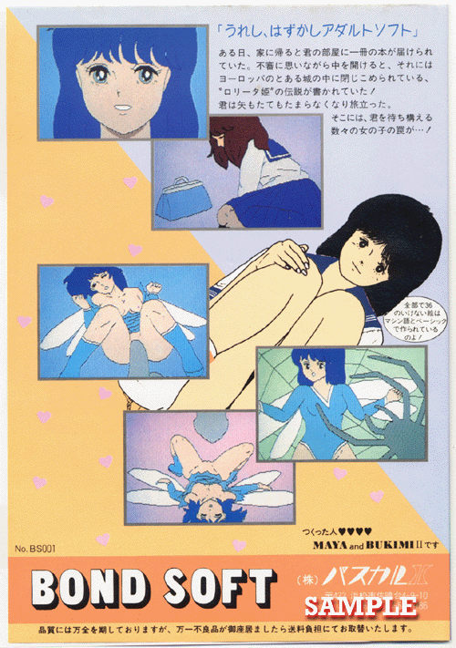 | 概要 | ヨーロッパのとある城に閉じ込められている「ロリータ姫」を救出すべく立ち上るプレーヤーの行く手に、女の子たちのさまざまな罠が待ち受けていた・・というストーリー。コマンド入力ゲームなので、ちょっと面倒だが、次々におまたを開いた女の子が出現。このゲーム、かなり難しく捨てカット的なシーンは存在しない。さらに後戻りができないので、そのシーンでできることはすべてやっておかないといけない。そうしないと、最後の最後でバービー人形を持っていなくてアウトなんてこともある。ワープの呪文が「おまん」だったり、浣腸したりとかなりエッチ。 | ||