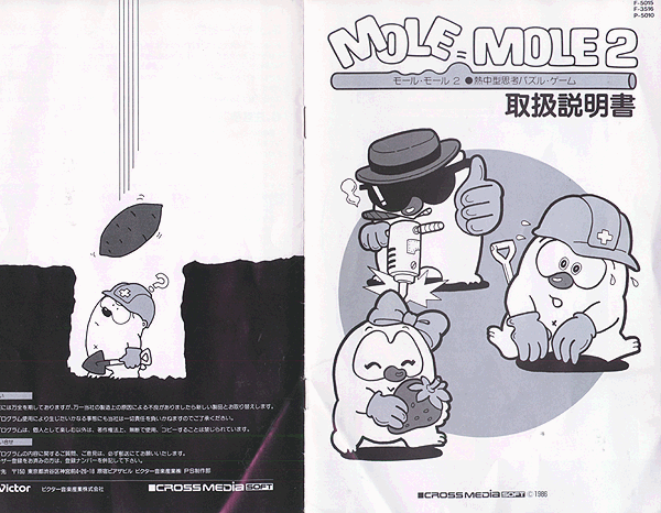 | 特徴(概要) | 前作「モールモール」の続編。今回は全部で40面。今回も前回に負けず劣らずの難問ばかり。今回の問題は、すべて一般ファンから送られたものばかりで構成されている。コンストラクションモードもついている。1とほとんどゲーム内容は同じだが、2は、モグラの動いた数を数えてくれるステップ表示が加わった。ステップ数は、クリアした画面の番号といっしょにディスクに記録されたので、最短手順を見つけるなんて目標もできた。 | ||