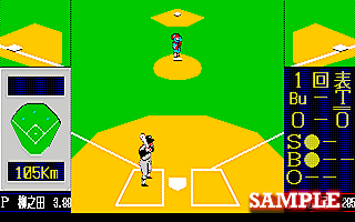 | 概要 | テレネットが発売したファミコンの「ファミスタ」を真似て作ったゲーム。しかし、内容は及びもつかない。電光掲示板の表示だけこっていて、肝心のうごき、野球の爽快感がまるでないのが痛い。選手は実名を使えなかったようで、やたらと「之」を使ってごまかしている。「村之田」「松之本」など。内角球を投げていれば、27奪三振で完全試合が達成できる。 | ||